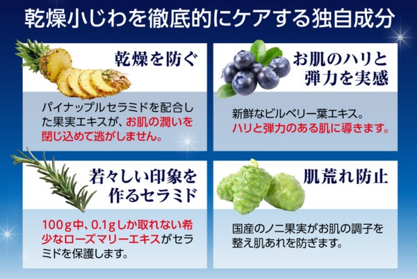 乾燥小じわには独自のマジカルフルーツ酸の力でハリと潤いのある肌へと導きます。